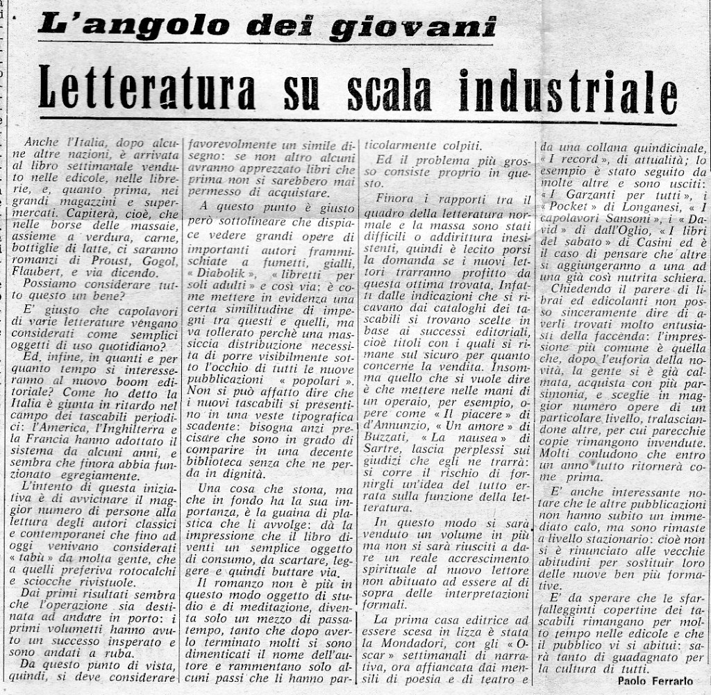 Paolo Ferrario, Letteratura su scala industriale, in ul Tivan, 20 novembre 1965