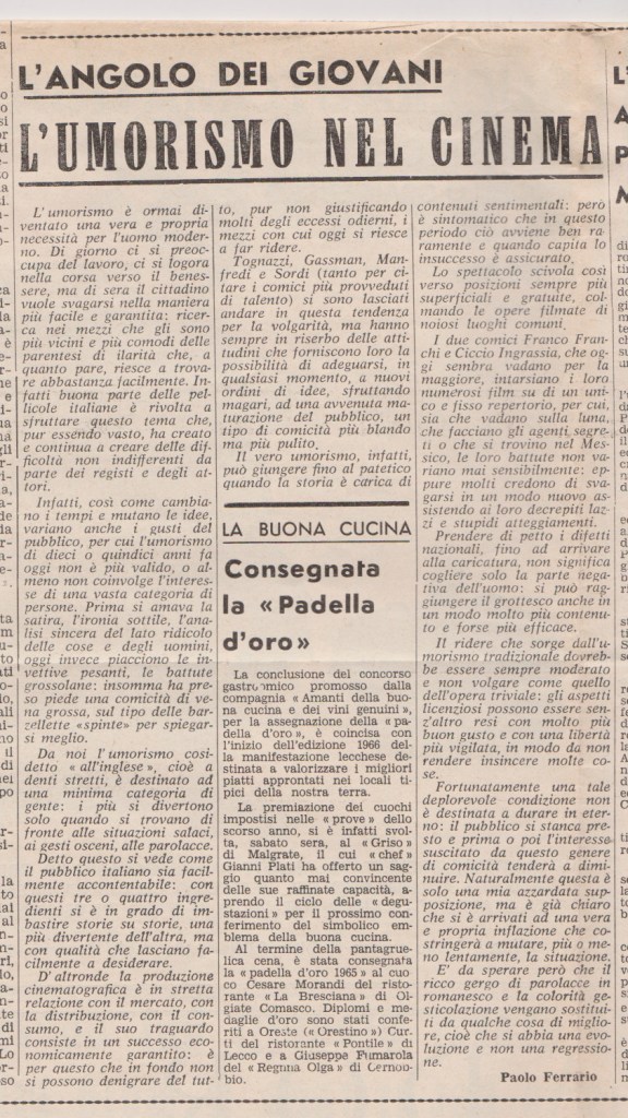 Paolo Ferrario, L’umorismo nel cinema, in L’angolo dei giovani/Ul Tivan, 29 gennaio 1966
