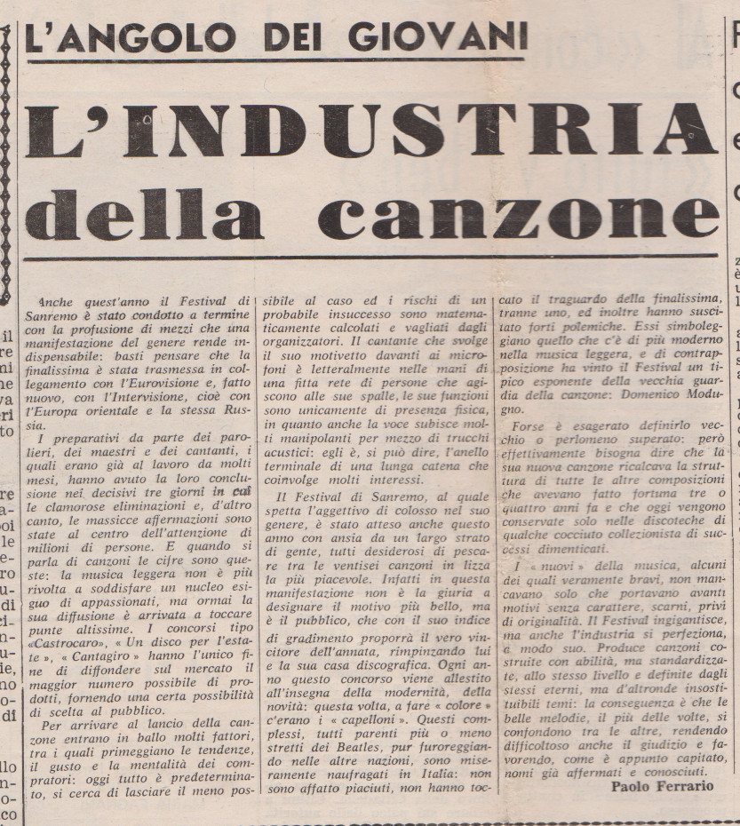 Paolo Ferrario, L’industria della canzone , in Ul Tivan 12 febbraio 1966