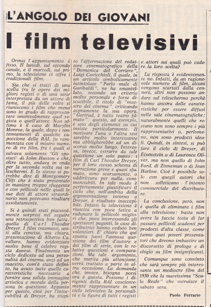 Paolo Ferrario, I film televisivi, in L’angolo dei giovani/Ul Tivan, 3 dicembre 1966