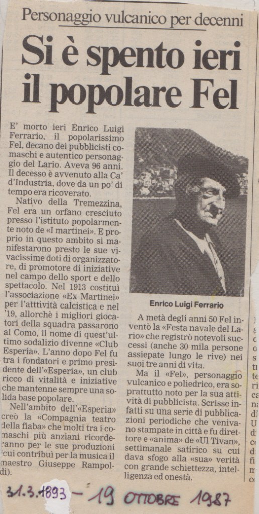 Si è spento ieri il popolare Fel (31/3/1893 – 19/10/1987), personaggio vulcanico per decenni,