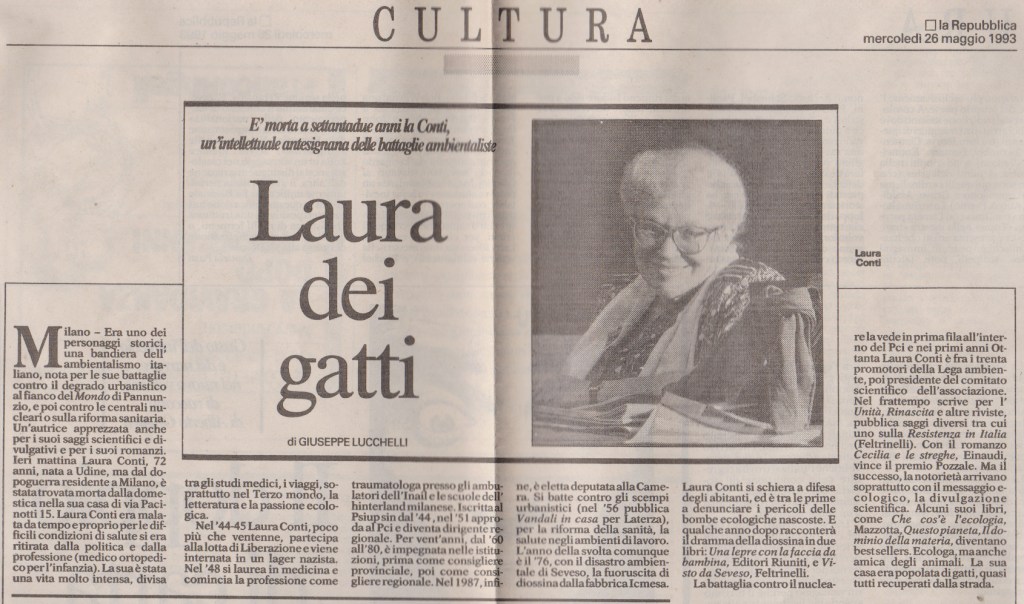 è morta a 72 anni Laura Conti. Laura dei gatti, di Giuseppe Lucchelli, in La Repubblica 16 maggio 1993