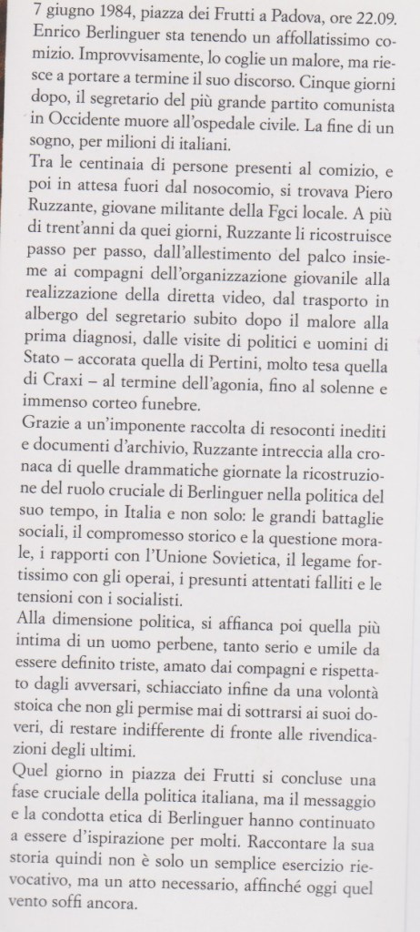Il sentimento che scaturisce dalla lettura è di commozione. La stessa commozione di quelle migliaia di militanti che in piazza, quel 7 giugno 1984, si rendono conto della tragedia che si sta consumando. Il libro affronta la vita di Berlinguer suggerendo tesi storiografiche innovative, come quando ipotizza che l’incidente automobilistico subito di Sofia nel 1973 giocò un ruolo determinante nell’elaborazione del compromesso storico. Oltre Berlinguer il campo progressista si è un po’ perso. Si sente il bisogno di tornare su quei passi, per studiarli e trarne insegnamenti. Il libro che Piero Ruzzante ha scritto insieme ad Antonio Martini e ha da poco pubblicato per Utet (Eppure il vento soffia ancora) non è un saggio su Enrico Berlinguer. È un diario, un album di memorie, individuali e collettive, che ripercorre con grande rigore, ora dopo ora, gli ultimi giorni della vita del segretario comunista.