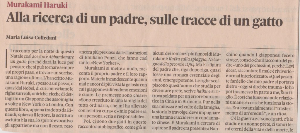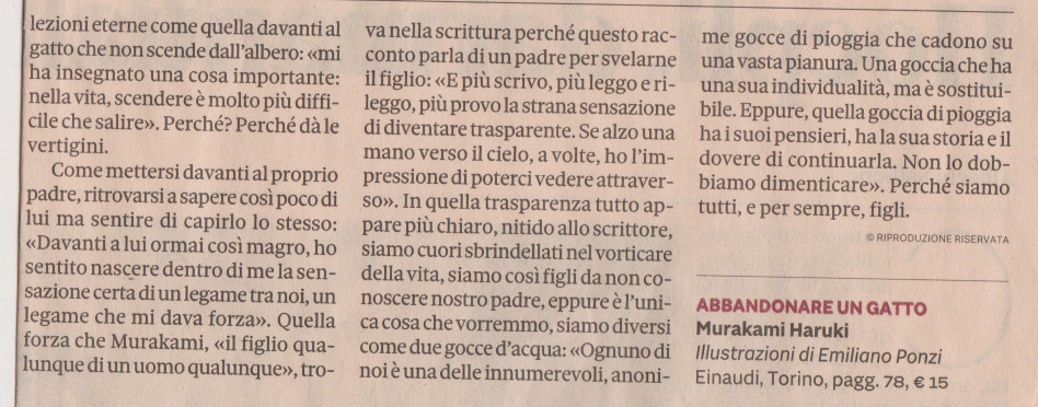 Abbandonare un gatto di Murakami Haruki (Einaudi). «Nei suoi romanzi e racconti Murakami ha creato un’infinità di mondi, e ne ha svelato ogni segreto ai lettori. Ma c’è una dimensione in cui la sua penna non si è quasi mai avventurata: la sua vita. Con Abbandonare un gatto, Murakami scrive per la prima volta della sua famiglia, e in particolare di suo padre. Ne nasce un ritratto toccante, il racconto sincero del “figlio qualunque di un uomo qualunque”. E forse proprio per questo speciale. A tradurre in immagini questo delicato racconto autobiografico, le invenzioni di uno dei più importanti illustratori contemporanei, Emiliano Ponzi, che con i suoi colori aggiunge poesia alla poesia in un’edizione unica al mondo. Il primo memoir del grande autore giapponese: un racconto inedito per un Murakami inedito» (dalla presentazione).