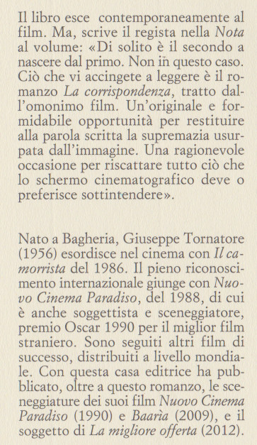 LA CORRISPONDENZA, di Giuseppe Tornatore, con Olga Kurylenko, Jeromy Irons, 2015. Dal libro: Tornatore Giuseppe, La corrispondenza, Sellerio editore, 2016 – Il Cinema Racconta …