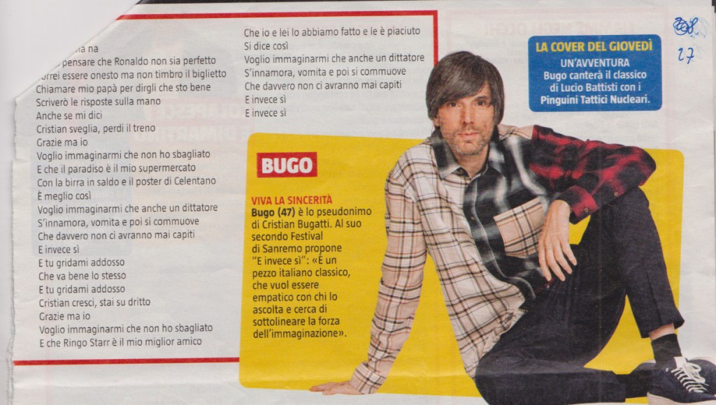 Festival di Sanremo Bugo canta ‘E invece sì’ St 20214 min Nella finale della quinta serata Bugo canta sul palco dell’Ariston il brano ‘E invece sì’ in gara al Festival di Sanremo 2021