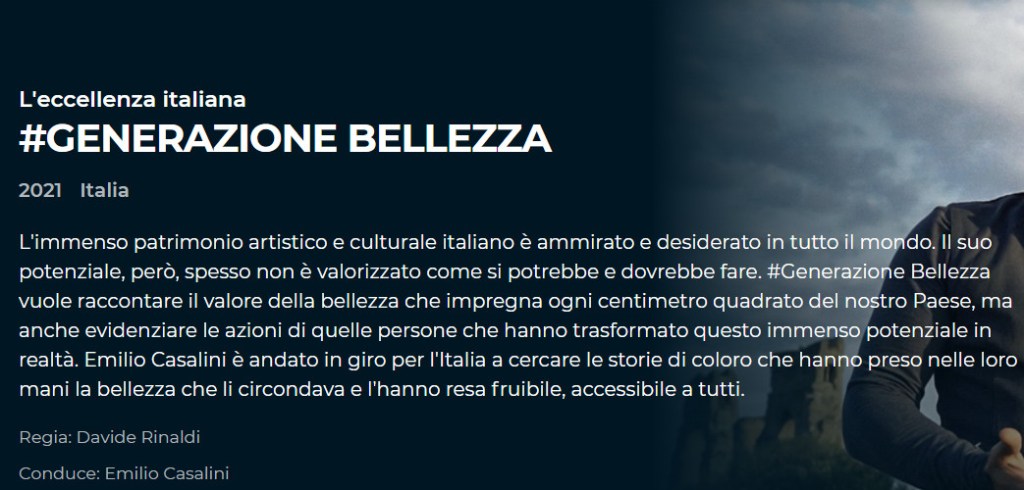 GENERAZIONE BELLEZZA, conduce Emilio Caslini, regia di Davide Rinaldi, Rai3, rivedibile tramite RaiPlay —————————————————————————————————– vai su rai play: https://www.raiplay.it/programmi/generazionebellezza https://www.raiplay.it/programmi/generazionebellezzahttps://www.raiplay.it/programmi/generazionebellezza Condividi: Fai clic per condividere su Facebook (Si apre in una nuova finestra) Facebook Fai clic qui per condividere su LinkedIn (Si apre in una nuova finestra) LinkedIn Fai clic per condividere su WhatsApp (Si apre in una nuova finestra) WhatsApp Fai clic qui per condividere su Tumblr (Si apre in una nuova finestra) Tumblr Fai clic per inviare un link a un amico via e-mail (Si apre in una nuova finestra) E-mail Fai clic qui per condividere su Pinterest (Si apre in una nuova finestra) Pinterest Fai clic qui per stampare (Si apre in una nuova finestra) Stampa Fai clic per condividere su Threads (Si apre in una nuova finestra) Threads Fai clic per condividere su Bluesky (Si apre in una nuova finestra) Bluesky Altro Fai clic per condividere su Print & DBF (Si apre in una nuova finestra) Print & DBF Mi piace Caricamento... Correlati