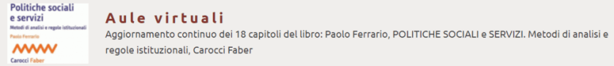 2. vai a: Aulevirt.com, Aggiornamento continuo del libro: Paolo Ferrario, POLITICHE SOCIALI E SERVIZI. Metodi di analisi e regole istituzionali, Carocci Faber
