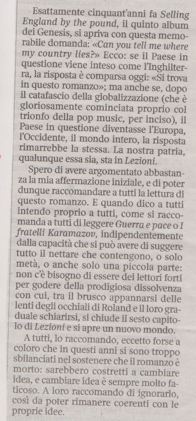 Ian McEwan. Leggete LEZIONI, Einaudi, 2023. “E’ il miglior romanzo di questo secolo”, di Sandro Veronesi, in La Lettura/Corriere della Sera, 9 aprile 2023