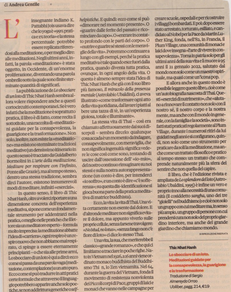 È il respiro consapevole l’inizio di ogni cambiamento. Il respiro è cura e guarigione dalle ferite nel corpo e nell’anima. È rivoluzione profonda e inesorabile nel cuore e nel mondo. Meditare è restare in contatto con questa verità che Thich Nhat Hanh, nel corso della sua esistenza, non ha mai smesso di trasmettere con amorevole compassione a discepoli e discepole di ogni dove.