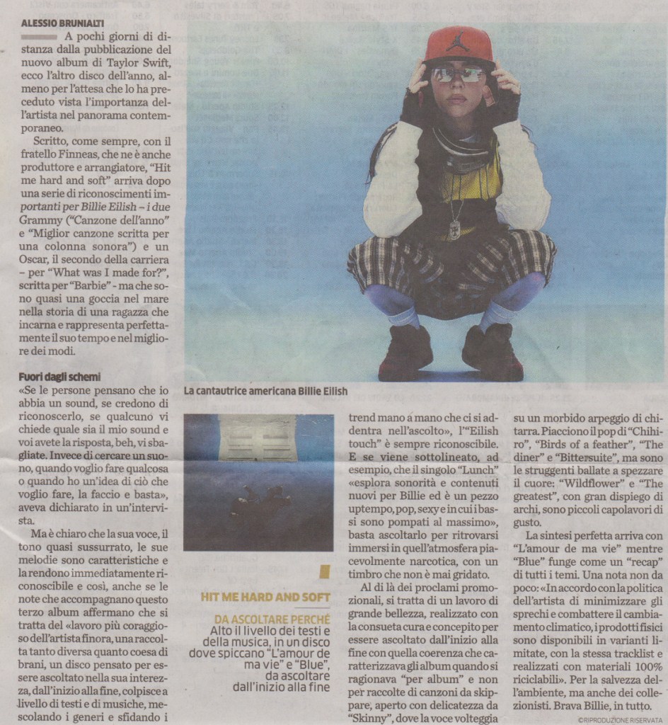 Billie Eilish, Hit me hard and soft, 2024. 10 brani, 44 minuti. Video: Lunch. Con una recensione di Alessio Brunialti, in La Provincia 29 giugno 2024 Skinny – 3:39 Lunch – 2:59 Chihiro – 5:03 Birds of a Feather – 3:30 Wildflower – 4:21 The Greatest – 4:53 L’amour de ma vie – 5:33 The Diner – 3:06 Bittersuite – 4:58 Blue – 5:43 vai a: Condividi: Fai clic per condividere su Facebook (Si apre in una nuova finestra) Facebook Fai clic qui per condividere su LinkedIn (Si apre in una nuova finestra) LinkedIn Fai clic per condividere su WhatsApp (Si apre in una nuova finestra) WhatsApp Fai clic qui per condividere su Tumblr (Si apre in una nuova finestra) Tumblr Fai clic per inviare un link a un amico via e-mail (Si apre in una nuova finestra) E-mail Fai clic qui per condividere su Pinterest (Si apre in una nuova finestra) Pinterest Fai clic qui per stampare (Si apre in una nuova finestra) Stampa Fai clic per condividere su Threads (Si apre in una nuova finestra) Threads Fai clic per condividere su Bluesky (Si apre in una nuova finestra) Bluesky Altro Fai clic per condividere su Print & DBF (Si apre in una nuova finestra) Print & DBF Mi piace Caricamento... Correlati