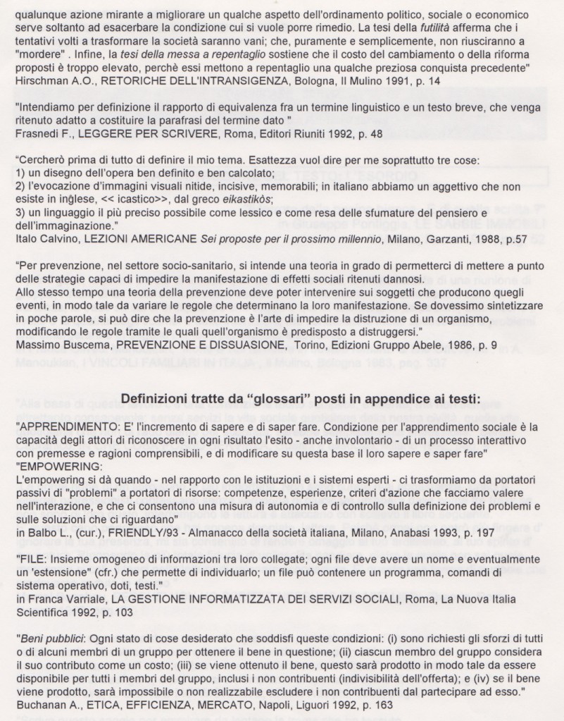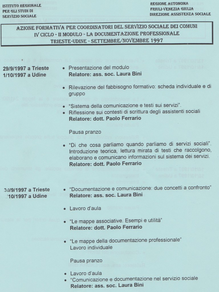 La DOCUMENTAZIONE PROFESSIONALE, azione formativa per coordinatori del servizio sociale dei Comuni. Laboratorio didattico a cura di Laura Bini e Paolo Ferrario, Istituto per gli studi sociali di Treiste, settembre/novembre 1997