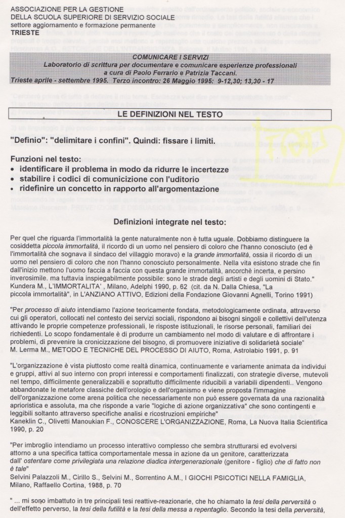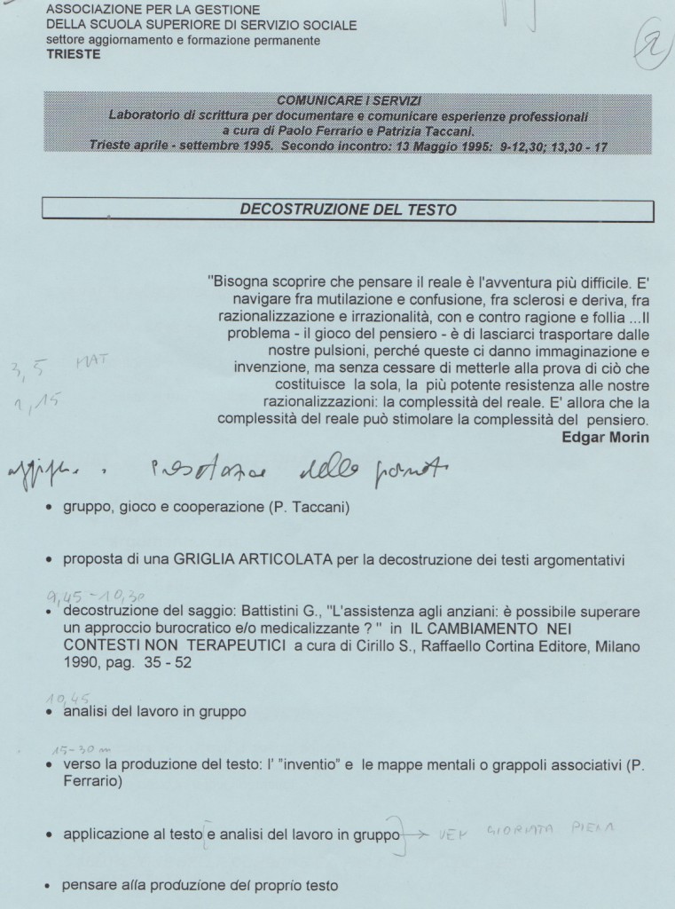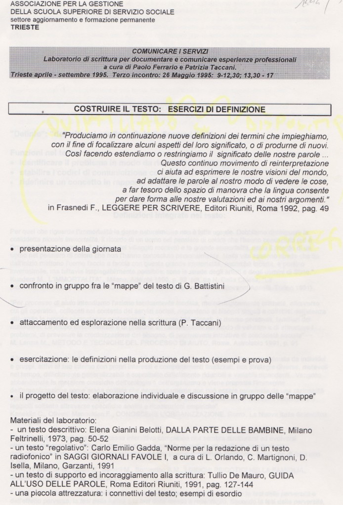 COMUNICARE I SERVIZI. Laboratorio di scrittura per documentare e comunicare esperienze professionali, a cura di Paolo Ferrario e Patrizia Taccani, alla Scuola superiore di servizio sociale di Trieste, 21 aprile, 13 e 25 maggio 1995