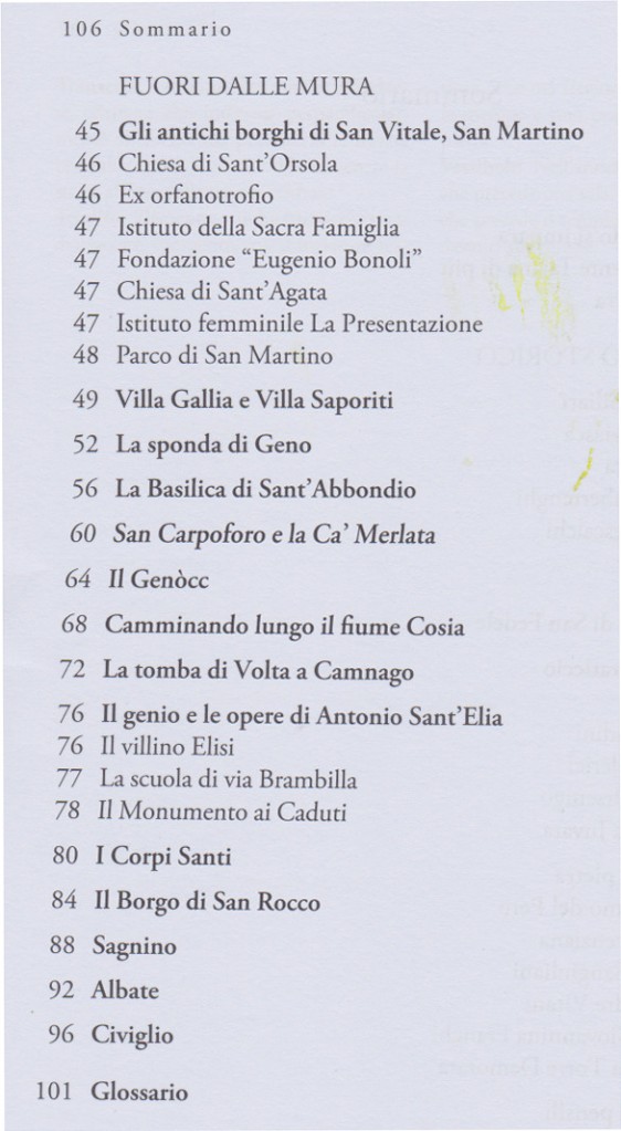 TAJANA Clemente, PASSEGGIATE COMASCHE. In cammino per Como e dintorni tra storia e futuro. Testi a cura di Piero Berra, copertina di Mirna Ortiz, New Press edizioni, 2023. Indice del libro